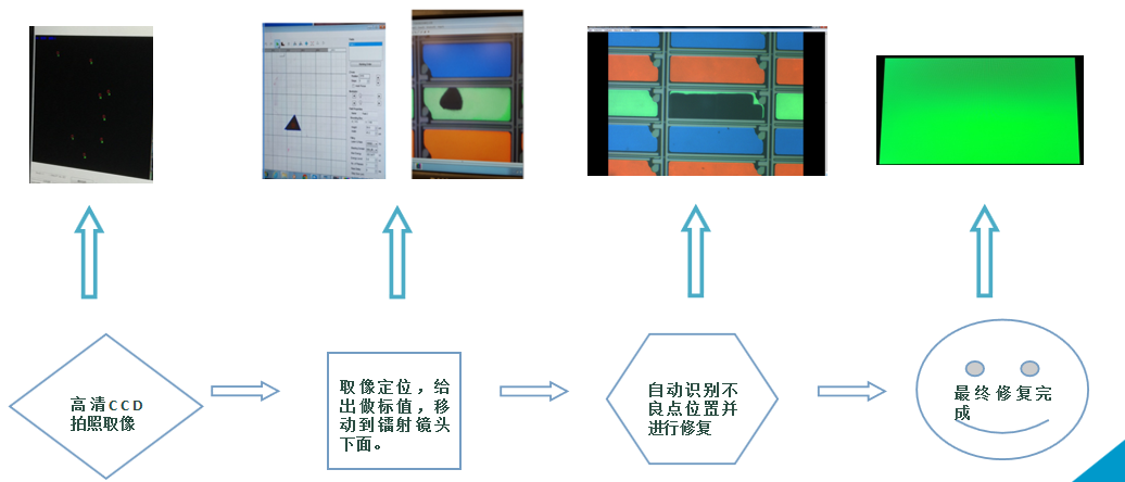 主要應用于TFT-LCD、IPS、LTPS、OLED等顯示面板行業,針對制程當中發光區域內產生的亮點、灰亮點、亮線不良進行鐳射修復。整個修復過程是通過高清像素CCD自動定位,拍照取像分析,給出不良點坐標,然后計算機根據指令將修復用的鐳射鏡頭移動到位,自動識別出不良點的形狀大小,激光會做出不同方式的維修。詳見如下圖解: